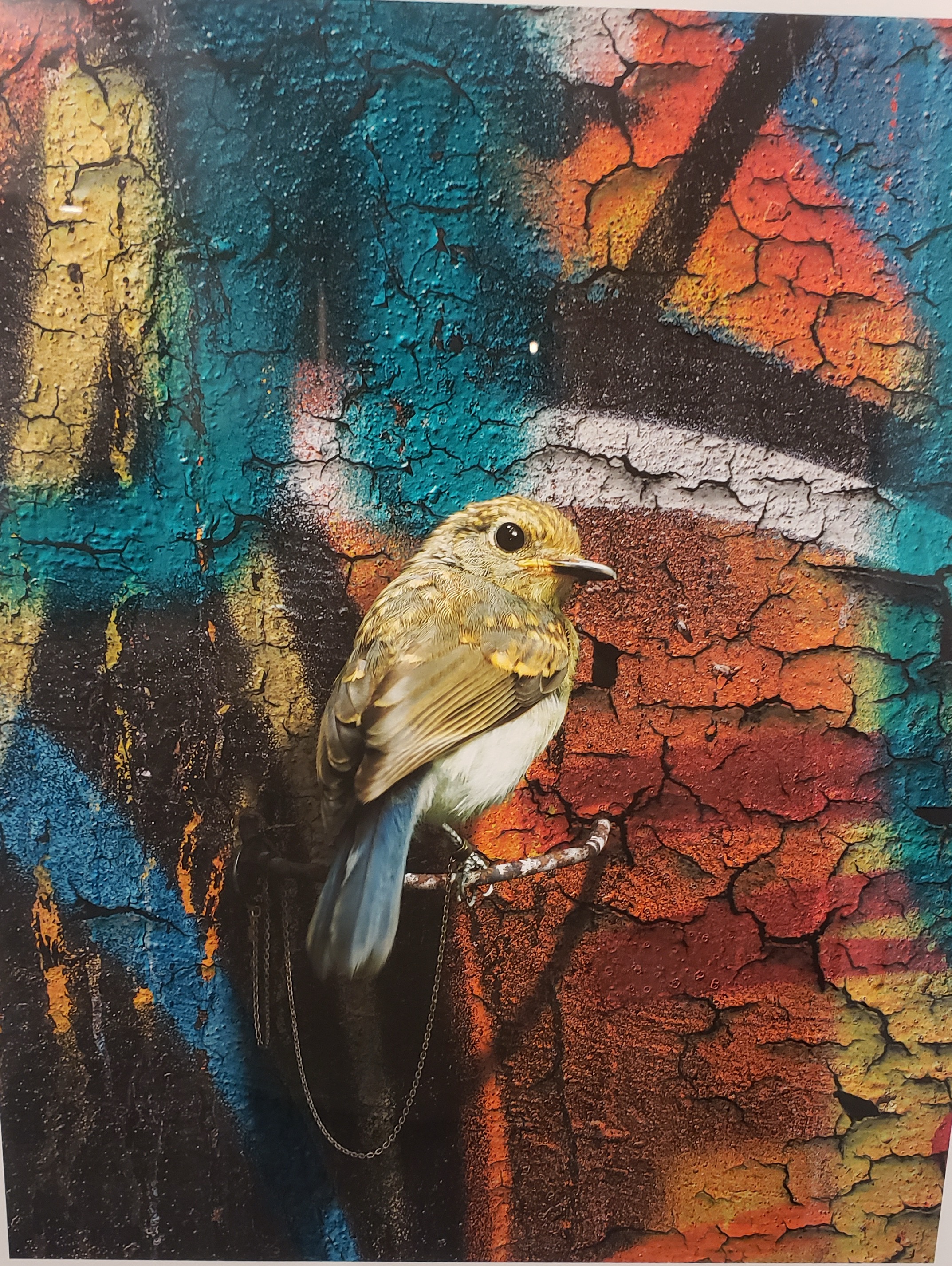 In my office, there is a painting of a beautiful, colorful bird. It lives next to the men's bathroom. I see it multiple times a day.