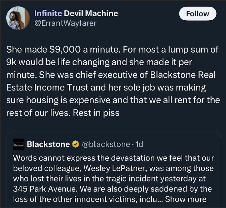 These examples fall into category 1. “I am doing poorly because of x,” leads to bitterness, hatred, antisemitism, racism, etc. This isn’t denying the realities of wealth inequality in this country. In response to difficult times, everyone must ask themselves, what am I realistically able to do? Murdering some rich CEO is not the answer. What does a society devolve into where any random vigilante feels emboldened to administer their own definition of justice without due process?