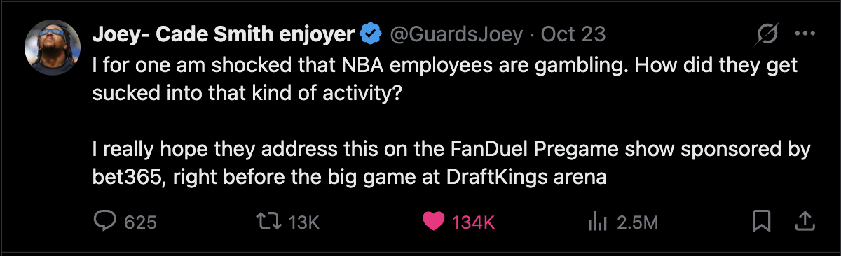 Now, the experience is completely frictionless (as all good tech is designed to be) and losing your money couldn’t be easier. I find it disturbing how ubiquitous sports gambling has become. You can’t watch any sports broadcast without constantly being marketed the betting app the program itself is sponsored by. For example: