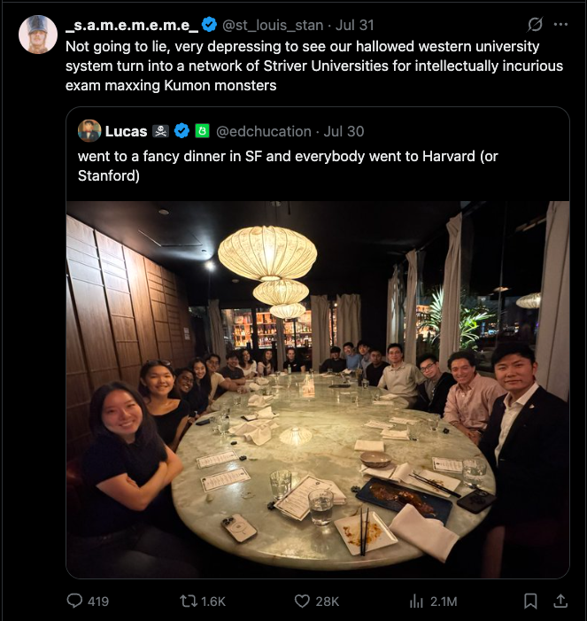 These dynamics also exist for romantic relationships. It is common for people to pursue a partner that elevates their own status. Their beauty, career, degree. I am not immune to the influence of status, either. It feels amazing to impress your friends and family with your partner. At the end of the day, though, all of that falls away and you realize that none of it ever mattered anyway. At best, these metrics serve as a proxy for who that person actual is.